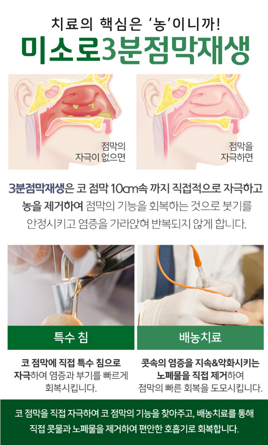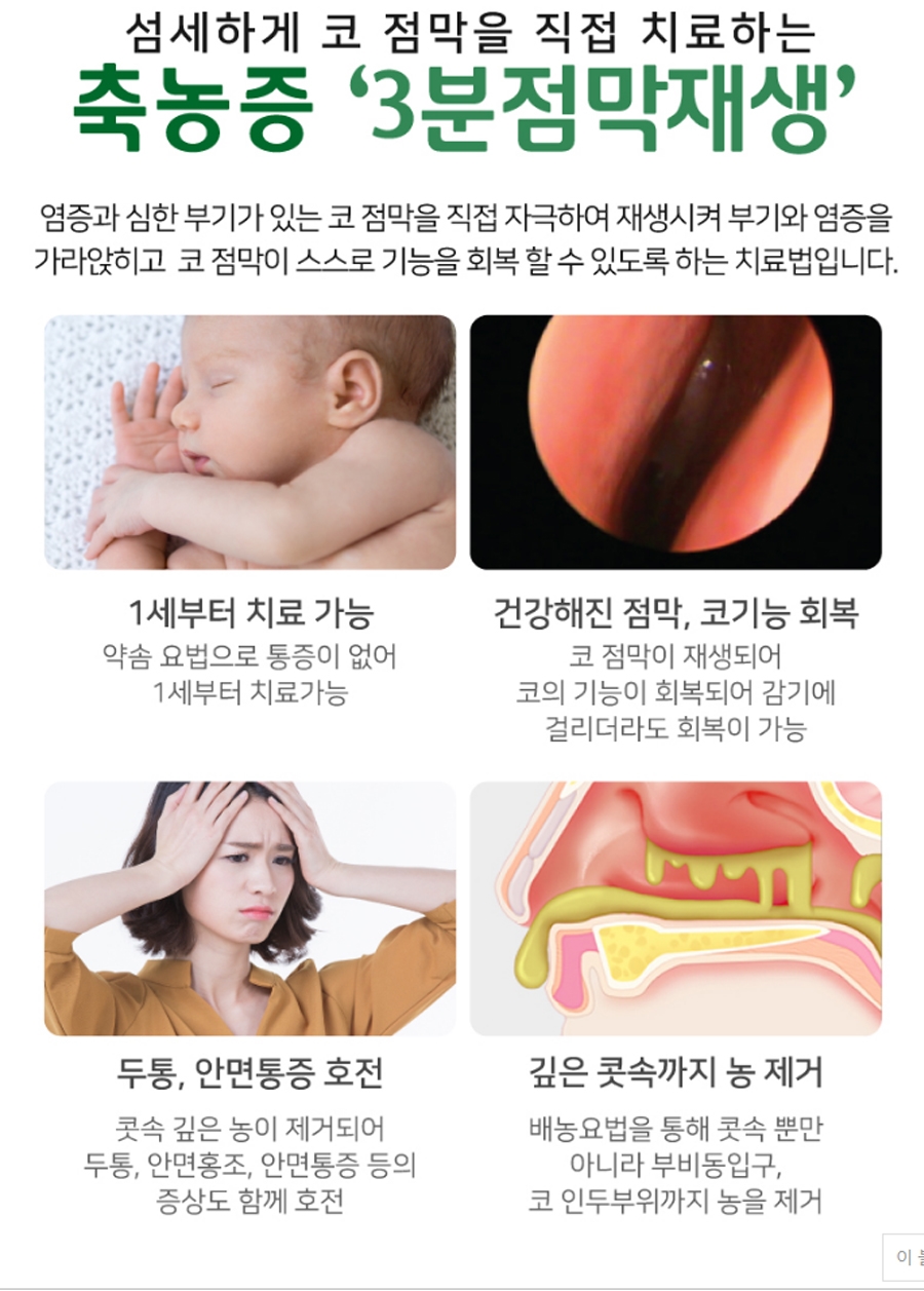 코점막이 부어오르고 자연공이 닫힐 수 있어 부기를 가라앉히는 게 첫 단계였습니다 이 밖에도 아데노이드의 비대화로 막히기도 했습니다. 이때 환기가 원활하지 못하고 섬모가 제 기능을 하지 못해 자연스럽게 농사가 쌓이게 되었습니다. 병증은 두통을 유발하기도 했어요.