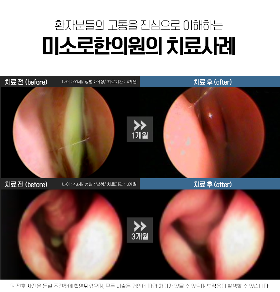 연령대가 낮을수록 귀와 편도안구로 전이될 수 있으며 결막염 중이염 등의 문제가 생길 수 있습니다. 또한 직업 특성상 이야기를 많이 하면 목소리의 변형이 나타날 수 있고 호흡에 문제가 생겨 곤란한 상황을 겪기도 했습니다.