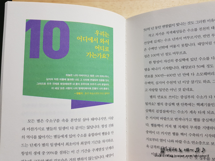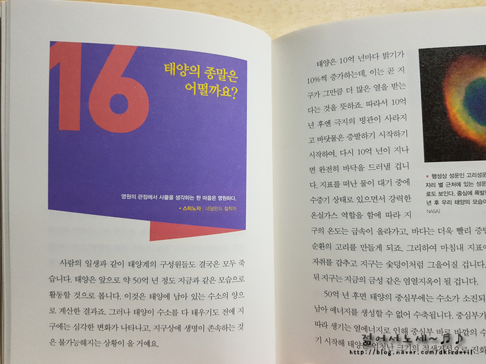 우주에 얽힌 재미있는 이야기와 함께 멋진 우주 사진도 만나볼 수 있습니다.아름다운 사진들이 많지만 가장 먼저 지구의 모습을 찍은 사진 ‘블루마블’이 가장 인상적입니다.인류 최초의 우주에서 지구를 바라본 느낌은 과연 어땠을까요? 저 같으면 눈물샘이 터졌을 거예요.