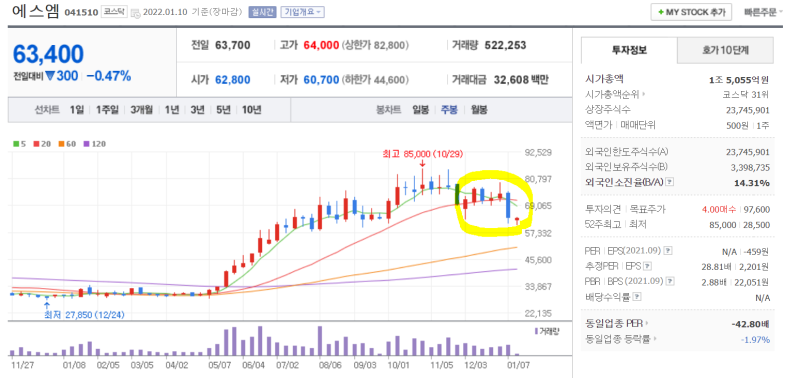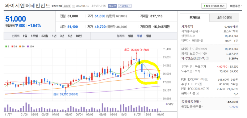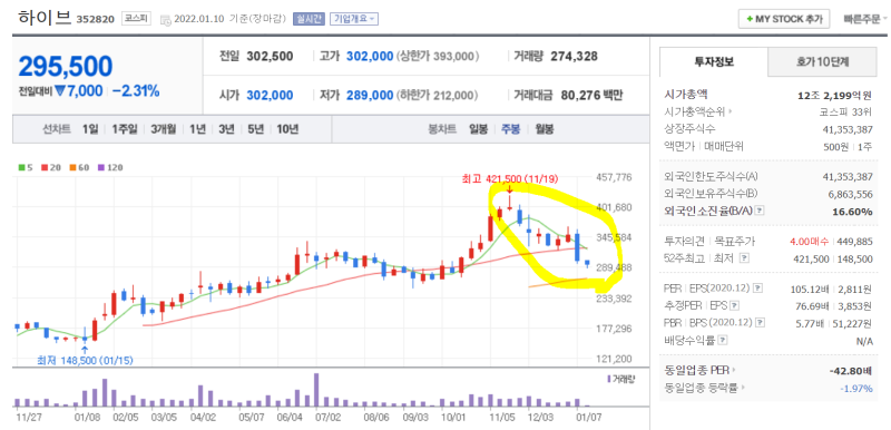 엔터주는 글로벌 한류 콘텐츠 열풍과 함께 긍정적으로 예상했지만 주가는 타격을 받고 있다. 주가 하락 요인은 명확히 할 수 없지만 애청하는 이기훈 아날은 다음과 같은 이유라고 말했다.1) 4분기 실적 부진 및 2) 금리 상승에 따른 가치주 로테이션(여기에 코로나 장기화 추가하면 되나?)
