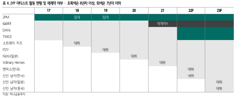 하이브: 모멘텀 많은 2분기 목표주가 43만원 유지제4분기 예상 매출/영업 이익 3,938억원(+26%YoY, 이하 YoY)/716억원(+29%)에서 합의 839억원을 밑돌 것만 다시 사상 최대의 이익이다. SEVENTEEN복귀(205만장), BTS의 LA투어 4회(21만명)및 온라인 투어(60만명)등이 반영됐다. 다만 오프라인 투어 관련 MD물류 차질(OP50~70억원)이 있었다. 물류 관련 이슈가 실적 부진의 주요 원인으로 반복되면서 주가에 영향을 주고 있다. 메타 버스 이전에 현실 물류부터 살펴야 한다.제2분기에 미셸 위 버즈 2.0업데이트, NFT거래소 설립, 이타카 홀딩스 입점, BTS복귀 등이 연결된 행사가 예상된다. 이 밖에 상반기 오프 라인 투어 재개, 신인 여성 그룹 2팀(오도아, 소스 뮤직)BTS관련 게임 등이 계획되고 있다.JYP 스트레이 키즈 주목 목표주가 64,000원 유지4분기 예상 매출액/영업이익은 159억원(+20%), 170억원(+51%)으로 콘센(501억원)에 부합할 것이다. 스트레이 키즈, 트와이스 컴백으로 앨범이 190만장 판매됐고 니쥬도 일본에서 컴백했다. 일회성 컨설팅 비용 10억원이 반영될 것이다.1분기에는 신인 걸그룹 엔믹스(블라인드 패키지) 데뷔, 트와이스의 미국 투어(7회) 등이 반영된다. 연내 엔믹스 외 1팀(남자, 라우드), 2023년 일본/중국에서 각각 남자 1팀씩 데뷔한다. 하반기에 자사몰 구축을 계획하고 있다. 니쥬의 첫 번째 투어도 시작될 것이다.JYP 아티스트 활동 현황 계획올해 최대 모멘텀은 스트레이 키즈다. 연간 음반 판매량 기준 데뷔 4년 만에 Top5(NCT, BTS, 세븐틴, 엑소)에 진입했다. 2019년 앨범당 판매량 20만장에서 2년 만에 120만장 6배 성장했다. 시장의 예상을 뛰어넘는 상당한 투어 규모의 증가가 있을 것이다.SM: 여전히 가장 저평가된 엔터주 목표주가 100,000원으로 하향 조정제4분기 예상 매출액/영업 이익 1927억원(+5%), 184억원(+1268%)에서 합의(266억원)를 밑돌 것이다. 다양한 아티스트의 컴백으로 앨범 판매량 420만장을 기록하고 165억원의 영업 이익이 예상되고 좋은 실적에 따른 인센티브를 보수적으로 가정했다. 주요 자회사는 키 이스트 드라마 2개 편성(구경꾼, 혼자만), C&C는 광고 번망기로 흑자 예상, 드림 메이커는 NCT공연 등으로 제3분기보다 개선, 디어 유는 IPO수수료 30억원이 1회 성에서 반영된다. 제4분기 실적 부진에도 불구하고 연간 750억원이라는 사상 최대의 이익을 달성하고 메타 버스/NFT관련 모멘텀이 되었음에도 불구하고 2023년 예상 PER기준으로 다시 20배로 돌아왔다. CJ ENM용 인수 가능성이 계속 늦어지면서 라이크 기획의 로열티 구조 해소가 늦어지고 있기 때문이다. 이 회사의 밸류에이션 할인 요소인 만큼 계속 주목할 필요가 있다. 목표 주가는 10만원에 5%(실적 하향 연계) 내린다.빅뱅 블랙핑크 목표주가 81000원으로 하향 조정4분기 예상 매출액, 영업이익은 각각 724억원(13%), 83억원(37%)으로 컨센서스 34억원을 밑돌 것이다. 송민호 외에 컴백이 부재해 20만장 판매량에 불과했다. 드라마 조선구마사 관련 일회성 비용(20억원)이 반영된다. 블랙핑크의 위버스 입점 후 높은 시너지를 기대했지만 컴백 자체가 지연되고 있어 올 상반기 컴백 시점에서 재확인할 수 있을 것이다. 연내 신인 걸그룹 데뷔도 계획돼 있다.YG 엔터테인먼트다만 마찬가지로 코로나 문제로 활동이 제약받고 있음에도 불구하고 다른 기획사들은 많은 가수들을 컴백시켰다. 이것은 팬덤에 대한 소통이자 노력인데 YG는 그 부분에서 매우 아쉽다. 이익 관점과는 별개로 아티스트들이 더 자주 컴백할 필요가 있다. 4분기 실적 부진을 반영해 목표주가를 81,000원으로 14% 내린다.다만 마찬가지로 코로나 문제로 활동이 제약받고 있음에도 불구하고 다른 기획사들은 많은 가수들을 컴백시켰다. 이것은 팬덤에 대한 소통이자 노력인데 YG는 그 부분에서 매우 아쉽다. 이익 관점과는 별개로 아티스트들이 더 자주 컴백할 필요가 있다. 4분기 실적 부진을 반영해 목표주가를 81,000원으로 14% 내린다.이상입니다 엔터주의 락바텀이 맞기를 바랍니다. 분석가 이기훈 리포트의 원문은 아래에 있습니다. 투자에 참고해주세요. 첨부파일 I_Broadcasting&En_20220110_Hana_760161.pdf 파일 다운로드 내 컴퓨터 저장네이버 MYBOX에 저장트와이스 파이팅!엔터주의 숨은 가치 NFT/메타버스 관련주(이기훈 애널리스트) 하나금융투자 이기훈 애널리스트 영상을 보고 유익하니 따로 적어보겠습니다. 이 글을 읽을지 모르겠지만 매번 감사합니다.blog.naver.com엔터주의 숨은 가치 NFT/메타버스 관련주(이기훈 애널리스트) 하나금융투자 이기훈 애널리스트 영상을 보고 유익하니 따로 적어보겠습니다. 이 글을 읽을지 모르겠지만 매번 감사합니다.blog.naver.com엔터주의 숨은 가치 NFT/메타버스 관련주(이기훈 애널리스트) 하나금융투자 이기훈 애널리스트 영상을 보고 유익하니 따로 적어보겠습니다. 이 글을 읽을지 모르겠지만 매번 감사합니다.blog.naver.com