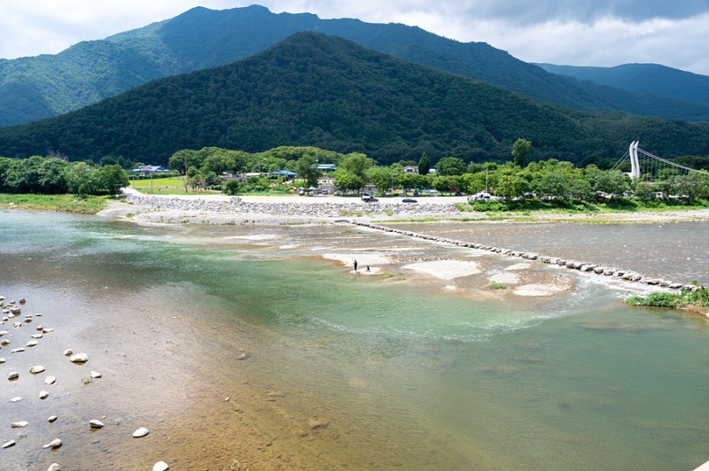 以前探した時とは違って川の水が荒々しく流れます。 最近特に雨が多いからでしょう。 それで川の真ん中に架かる飛び石は残念ながら統制されていて残念な気持ちもありました。