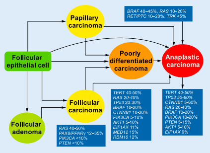 출처 : Pathologe 2020.41 (Suppl1) : S1 – S8 다양한 종류의 갑상선암이 있지만 위의 모식도는 가장 일반적인 folliculare pithelial cell에서 발생하는 아형이다(세부에 들어가면 더 복잡해진다!). 물론 그중에서도 가장 일반적인 것은 유두암(papillary carcinoma)으로 전체 80% 이상, 그 다음으로 일반적인 여포암(follicular carcinoma)의 경우 전체 10% 정도를 차지한다. 유두암과 여포암 모두 예후가 매우 좋기 때문에 일반적인 건강검진 상황에서 갑상선암을 만나면 환자에게 ‘제 때 발견했으니 잘 치료받으면 여생을 사는 데 큰 문제가 없을 것입니다’하고 위로의 말을 한다.