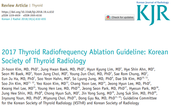 대한갑상선영상의학회 고주파절제술 가이드라인 여러 과에서 갑상선결절 치료를 하고 있지만 초음파를 이용한 치료법에 있어서는 영상의학과가 선두주자라고 자부한다. 특히 대한갑상선영상의학회 교수들은 뵐 때마다 빛나는 느낌을 받을 정도로 열정적이다. 2017 갑상선 고주파 절제술 지침을 제시하였으며 갑상선암에서의 적용은 다음과 같다.
