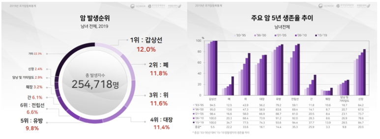 출처 : 2019 암등록통계 2019년까지 통계된 자료 기준 우리나라에서 갑상선암은 가장 높은 발생률을 보이는 동시에 100%의 5년 생존율을 보이는 암이다. 5년 생존율은 ‘암 치료를 받은 환자 중 치료 시작 5년 이내에 해당 암으로 사망하지 않은 환자의 비율’로 현 시점에서 100명이 갑상선암 진단을 받고 정해진 치료만 잘 받으면 5년 뒤 100명이 생존할 수 있다는 의미다.
