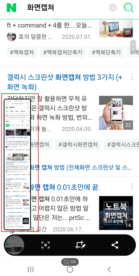 보이는 화면뿐만 아니라 밑에 숨어있는 내용도 같이 넣는 것을 스크롤 캡처라고 하는데, 먼저 스크린샷을 찍고 팝업되는 메뉴에서 아래로 화살표 아이콘을 누르면 보이지 않는 아래 내용까지 모두 담을 수 있습니다.