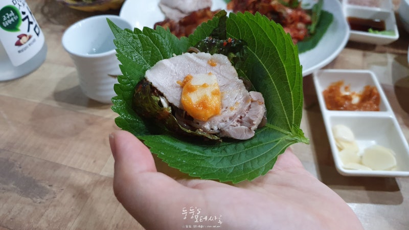 본격적으로 마늘 보쌈도 즐겨줍니다.박력있는 보쌈 두개를 상추와 깻잎에 올리고 마늘과 양파까지 더해 한입 먹어주니까~ 풍미가 넘치고 너무 맛있네요.(웃음)