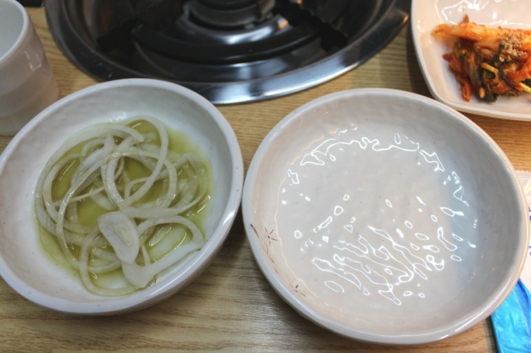 샤브샤브용 고기는 깻잎이나 양파절임이랑 같이 먹으면 더 맛있어요~가르쳐주셨습니다