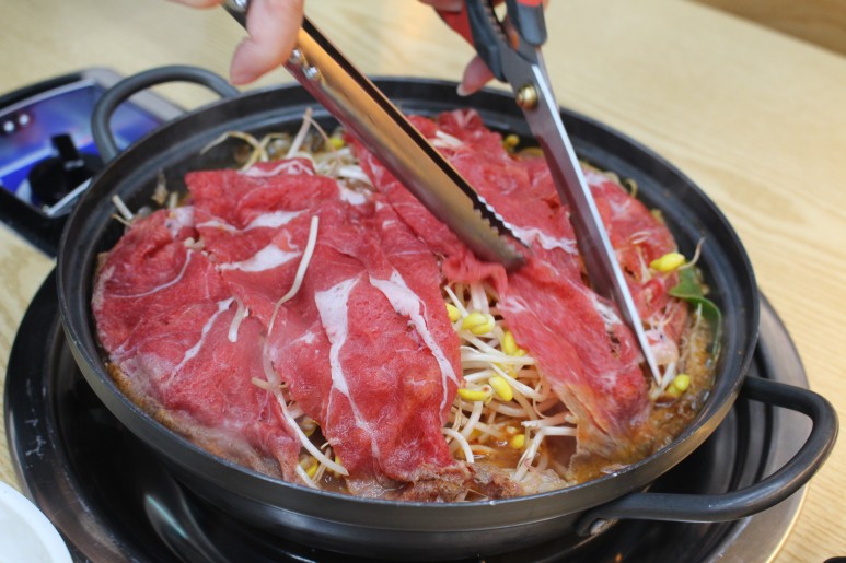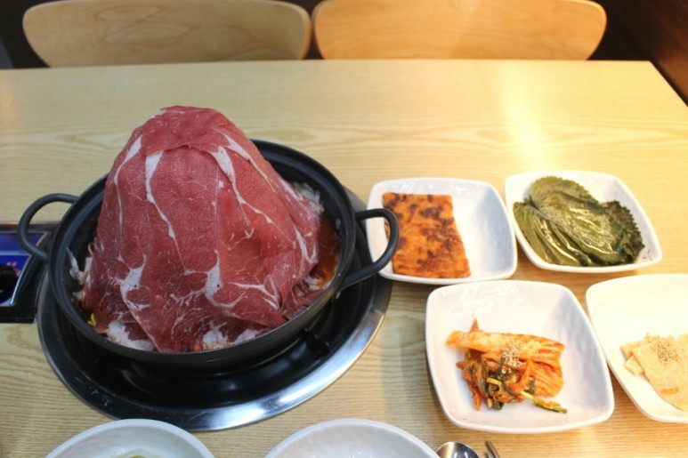 위에 올라가 있는 흐르는 듯한 가는 고기는 샤브샤브용으로 익으면 바로 먹을 수 있는 고기입니다!