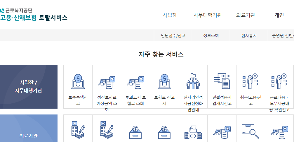 근로복지공단 고용·산재보험 토탈서비스 홈페이지에 접속하시면 됩니다.