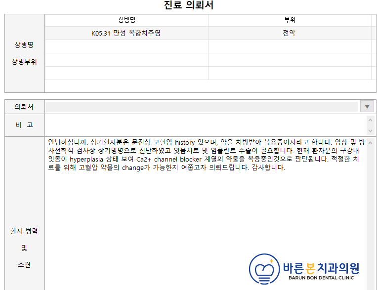 실제로 수원남문치과에서 내과에 전달한 진료의뢰서입니다.
