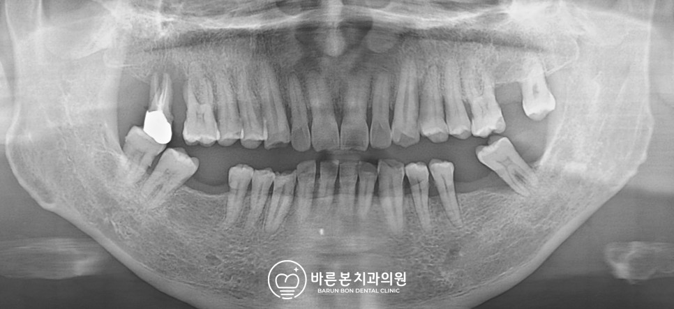 사진상 왼쪽 어금니에 이상이 보였는데, 치조골 소실이 심해 정출현상이 나타나고 있었습니다.