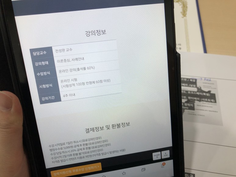 그러다가 마지막 한 곳만 보려고 여기 사이트에 들어가봤는데 여러 자격과정이 많이 있었어요. 게다가 사이트에 들어가자마자 눈에 띄는 문구가 바로 전액 장학금 지원을 통해 100% 무상으로 온라인 강의를 들을 수 있다는 것이었습니다.