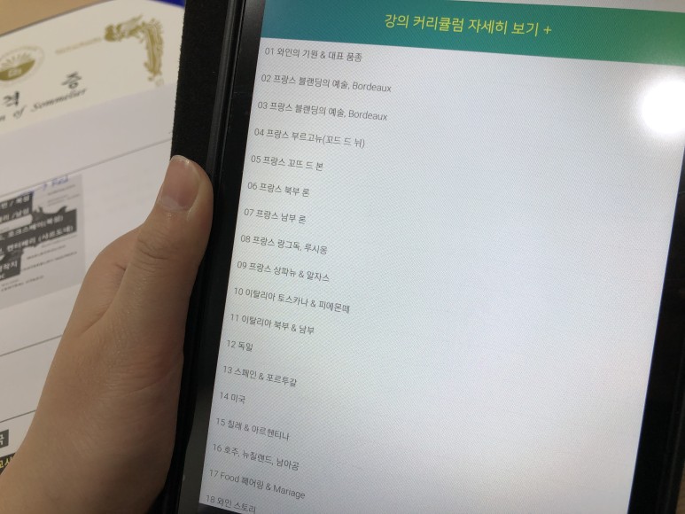 와인 소믈리에 자격증 강의는 하루에 세 개씩 들었어요. 그랬더니 2주 만에 다 보게 됐어요. 봐도 충분히 남는 시간이라 저는 제대로 학습하지 못하거나 들으면서 이해하지 못했던 강의를 다시 회독하면서 듣기도 했습니다.