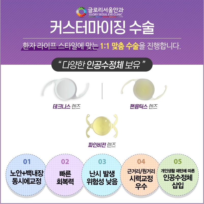 종류도 한두 가지가 아니기 때문에 백내장 수술 가격 상담을 진행하면서 적절한 인공수정체를 찾는 것이 중요했고, 만약 난시가 진행되고 있을 때는 난시 교정이 가능한 다초점 인공수정체로 선명하게 잘 보이는 시력을 되찾을 수 있어 걱정할 필요가 없었습니다.