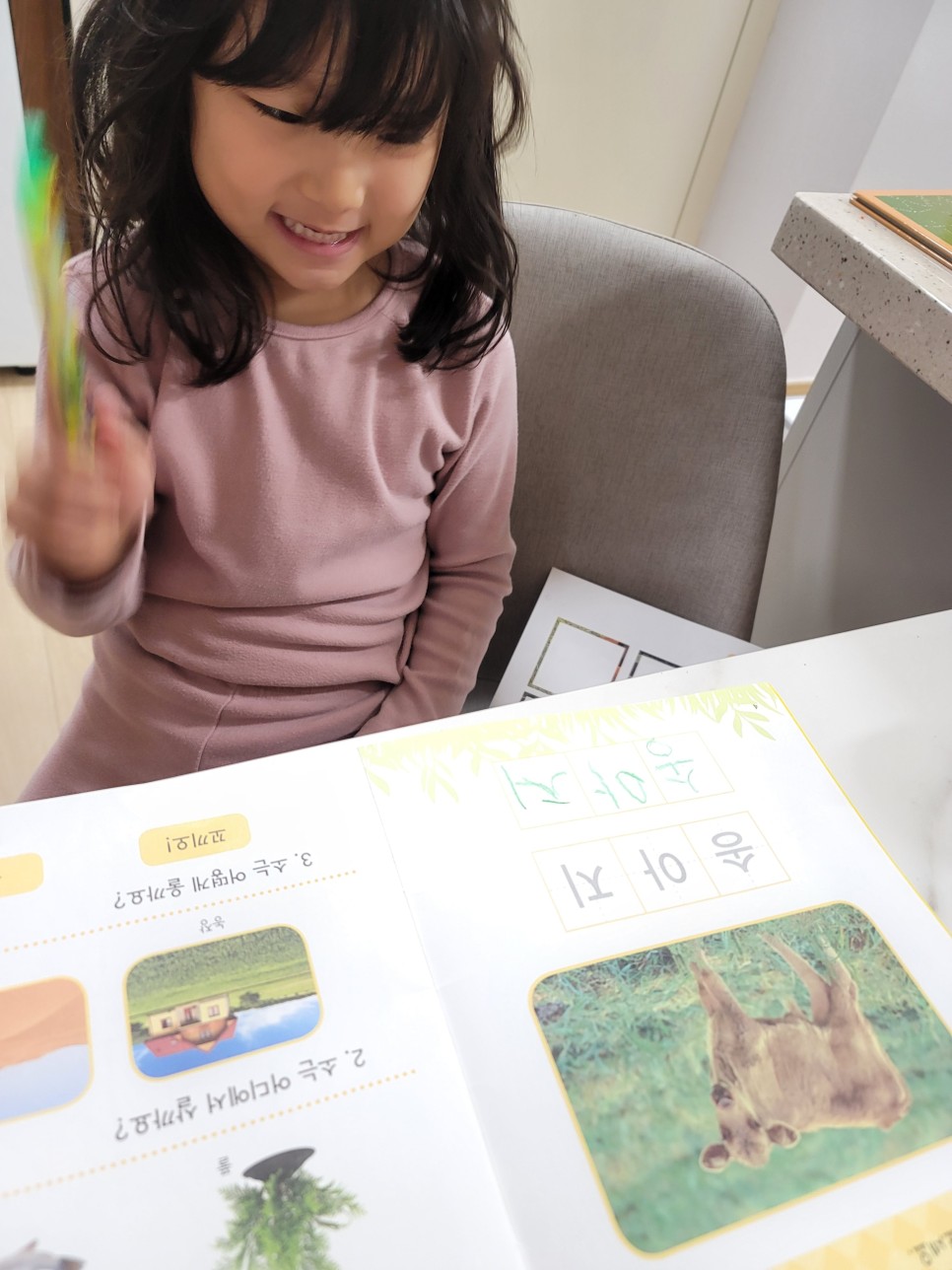 주말 아침 열공중 송아지를 제법 잘 따라하며 한글 학습지를 시작해야 할까 조금 고민했지만 아직 공부시키기 마음이 아파 여름으로 미루기로 했다.