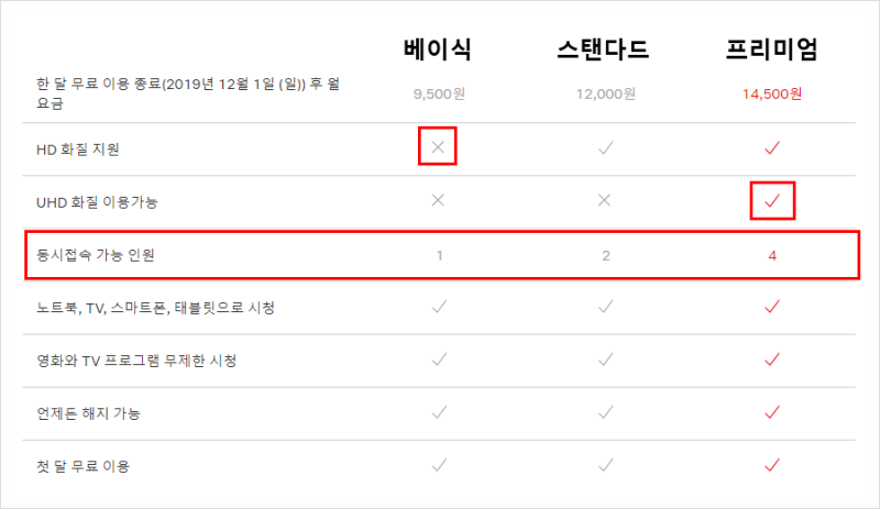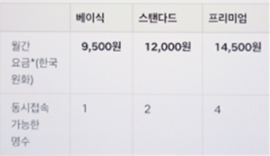 베이직 동시접속 인원 1명에게 기본 화질을 제공하며 스마트폰 or 태블릿 1대만 콘텐츠 저장이 가능합니다.스탠다드 동시접속 인원 2명에 1080 풀HD 화질을 제공합니다 기기 2대에 콘텐츠를 저장할 수 있으며 프리미엄 동시접속 인원 4명까지입니다.1080p 풀HD와 4K UHD 화질을 제공하며 저장 가능 기기는 4대입니다.
