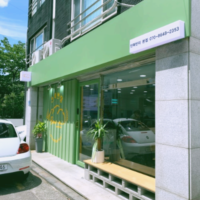 연한 그린 색상에 옐로우를 포인트로 외관이 장식되어 있었습니다.멀리서도 딱 눈에 띄었어요.
