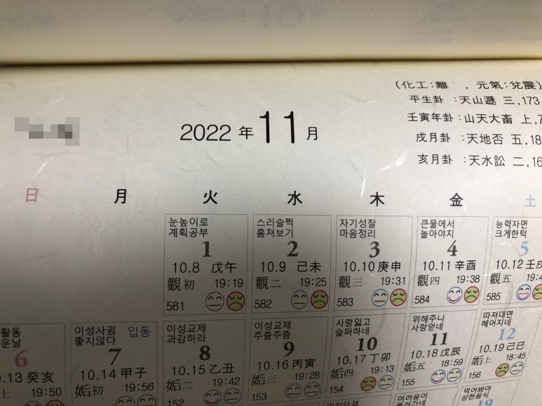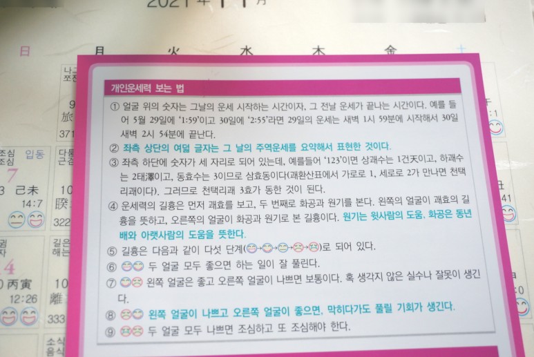 보통 달력과 다르니까 설명서도 친절하게 동봉되어 온다, 대략 정리하면 얼굴 위의 숫자는 그날의 운세가 시작되는 시간을 말하고 사자성어 같은 친구들은 그날의 주역 운세를 해설해 놓은 것이다. 스마일은 빙그레 웃을 정도로 해피 데이! 스마일이 통곡하고 있다면 그날 주의!
