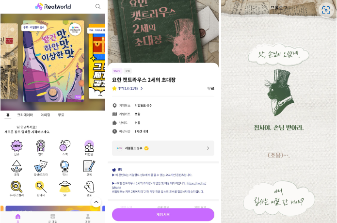 게임이 시작되면 증강현실에서 특정 단서를 투영하거나 챗봇 시스템으로 가상 캐릭터와 대화를 나눌 수 있다. 리얼한 게임 진행과 잘 꾸며진 공간 덕분에 이야기의 주인공이 되어 볼 수 있습니다. ‘세상은 거대한 놀이터’라는 리얼 월드의 캐치프레이즈를 직접 경험하고 지루한 일상에서 벗어나 상상이 가득한 공간에서 즐거운 시간을 가져보세요.