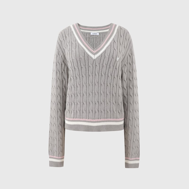 룩캐스트 그레이 보니 브이넥 니트 탑은 매력적인 그레이 컬러와 핑크, 화이트 라인 배색이 편안한 분위기의 브이넥 니트 탑입니다.