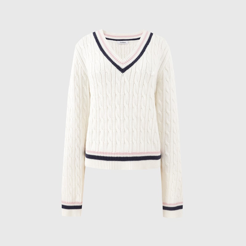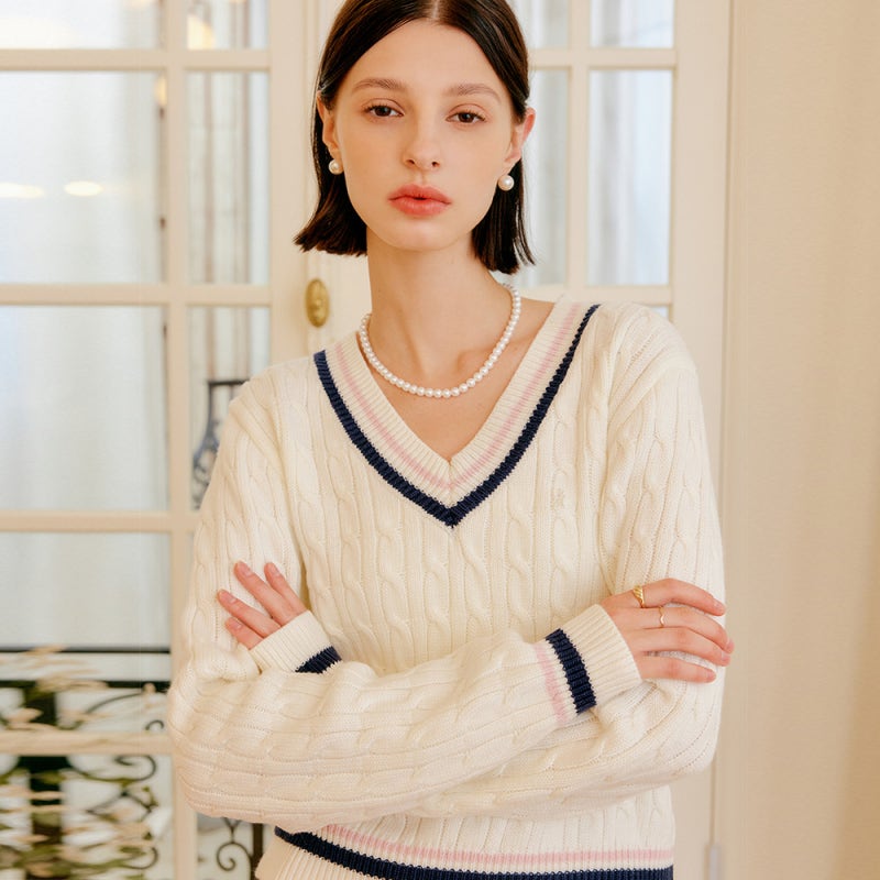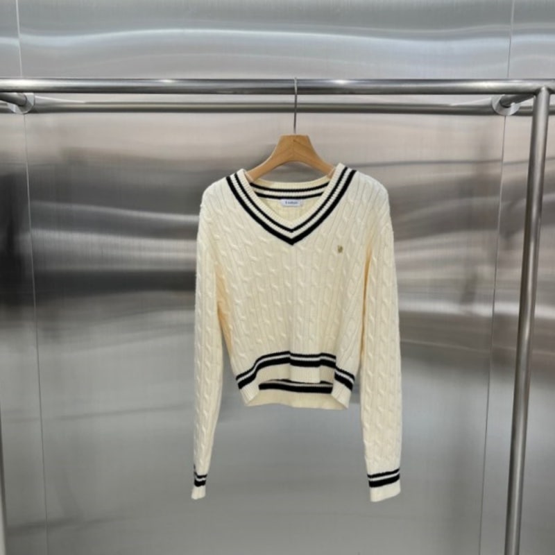룩캐스트 베이지의 보니 브이넥 니트 탑은 클래식함이 돋보이는 베이지, 블랙 라인이 어우러진 제품입니다.