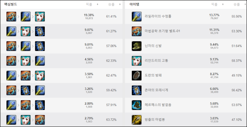 하단으로 스크롤하시면 해당 챔피언의 핵심 빌드와 아이템 리스트를 픽률과 승률에 따라 순위별로 확인하실 수 있습니다. 또한 신발이나 스타트 아이템도 모두 확인할 수 있습니다.
