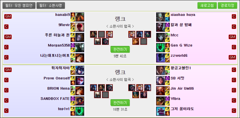 다음은 프로 관전입니다. 여기서는 등록된 프로게이머와 아마추어의 실시간 게임을 관람할 수 있습니다. 위 사진과 같이 “관람”을 클릭하면 여러 파일을 설치하고 바로 시청할 수 있습니다.
