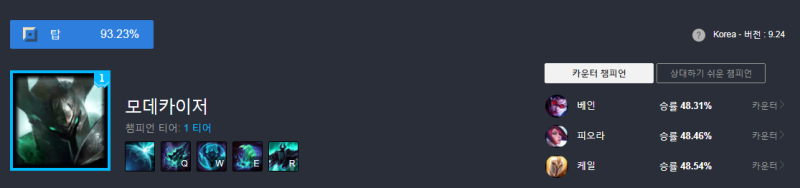 현재 톱 포지션에서 1위 1티어의 모델 카이저를 예로 들어 설명합니다. 위 사진에서 볼 수 있듯이 모델 카이저의 스킬 표시 위에 마우스 커서를 올려놓으면 기본적인 스킬을 자세히 확인할 수 있으며 카운터 챔피언과 상대하기 쉬운 챔피언 리스트를 3위까지 확인할 수 있습니다.