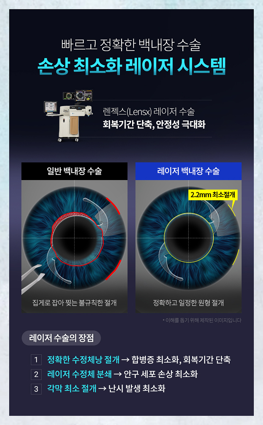 예전에는 담당의사가 직접 수정체낭을 절개하여 진동이 심한 초음파를 활용하여 단단한 수정체를 분쇄하는 것이 당연하였기 때문에 조직 손상은 물론 합병증의 발생 가능성을 배제할 수 없었지만,