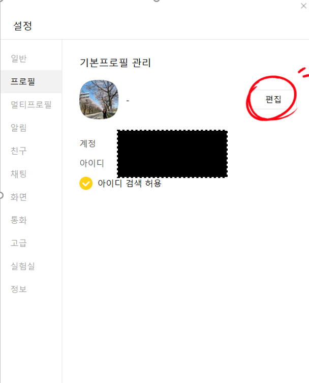 사진 보정 후 카카오톡 프로필 변경이 필요하신 분은 PC버전의 프로필 변경 기능이 필요합니다.