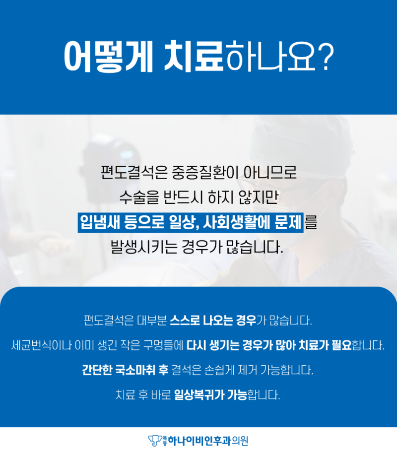 많은 분들이 편도결석으로 목동 하나이비인후과를 방문하셨고 편도부분절제술은 약 2000건 이상 진행하셨습니다. 수술이 아니더라도 편도결석 제거도 풍부한 경험을 바탕으로 가능하므로 언제든지 방문하여 치료와 상담을 받으시기 바랍니다.