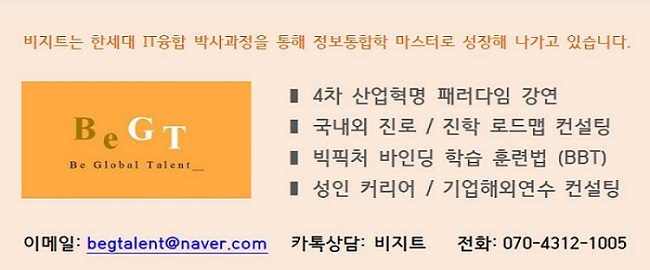 안녕하세요 비지트입니다. 데이터 사이언스/비즈니스 분석/데이터 분석, 그리고 인공지능 전문가 과정에… blog.naver.com 안녕하세요, 비지트입니다.요즘 좋은 소식보다는 정말 미래가 걱정되는 소식밖에 안 들리죠? 비지트…blog.naver.com 비지트는 IT융합 박사과정 중 4차 산업혁명 시대의 미래 생존전략가이자 정보통합학의 마스터로서 개인과 기업의 Globalisation에 힘쓰고 있습니다. ●4차 산업혁명 강연●대학(원) 진로진학 및 성인 커리어 컨설팅●빅픽처 창의성 훈련●기업해외연수 및 영어연수●기업혁신전략 및 국가컨설팅을 하고 있는 종합컨설팅 Firm입니다. 뉴욕과 런던 출신 비지트의 컨설팅을 받는 여러분은 특별한 5%입니다.】