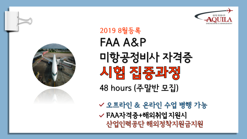 - 그럼 FAA 미국 항공정비사 자격증은 무엇일까요?FAA(미국 연방항공청)에서 발급하는 자격증으로 미국에서 제작하는 모든 비행기는 미국 항공정비사 자격증 소지자만이 정비할 수 있는 권한을 부여받습니다.