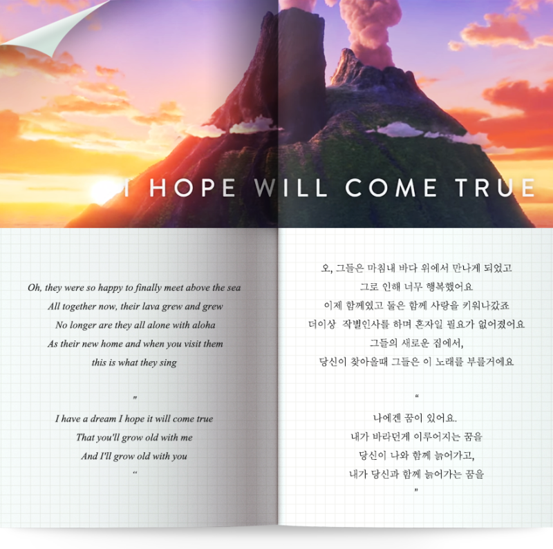 Oh they were sohappy 그들은 행복해졌어요 To finally meet above the sea 드디어 바다 위에서 만났거든요 All together now their lavagrew and grew 함께 그들의 화산은 자라왔어요 No longer are they all alone 더 이상 아무도 없어요 With Aloha as theirne 새로운 둥지 안에 인사하고 And when you go and visit the methy sing 당신이 그곳에 가면 이 노래를 듣게 될 거예요