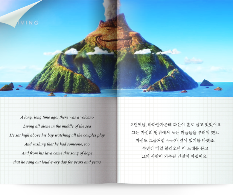 Alonglongtimeago 옛날 옛적에 Therewasavolcano 화산섬이 있었습니다.Livingall alone in the middle of the sea 바다 한가운데 혼자 있는 Hesathighabovehisbay 해변 위에서 Watching all the couplesplay 커플들이 노는 것을 지켜보면서 Andwishing the had someonetoo 그도 누군가 있었으면 좋겠다고 생각했습니다.