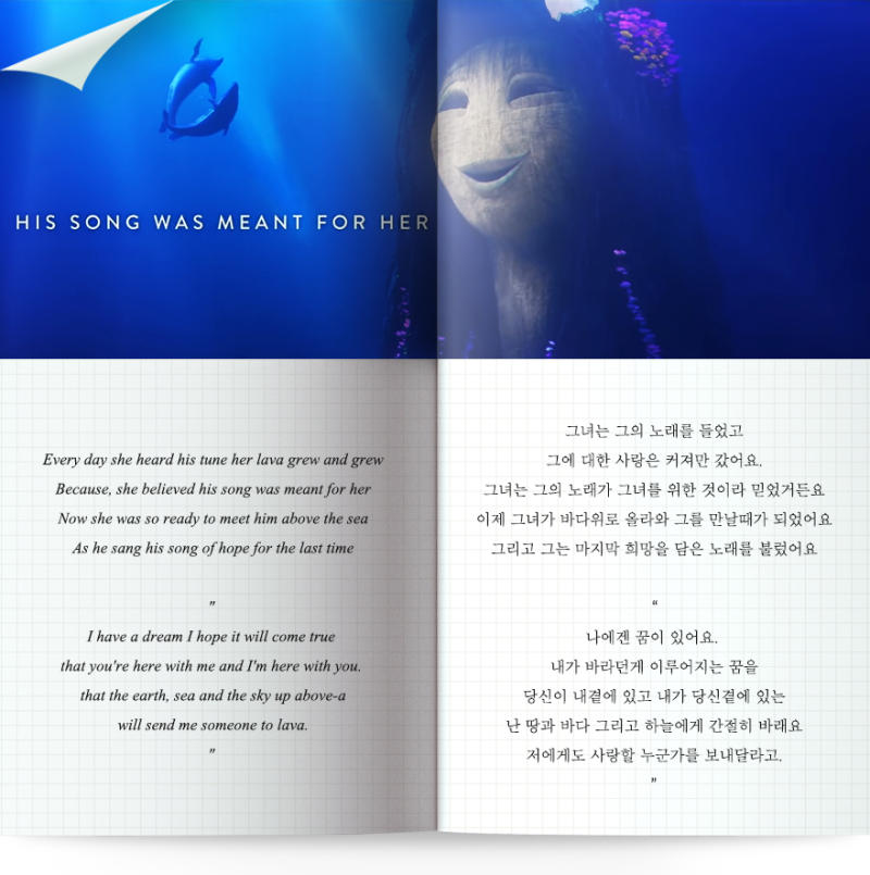Everyday she heard histune 매일 그녀는 그의 노랫소리를 들었습니다 Her lava grew and grew 그녀의 화산은 자라왔습니다 Because she believed his song was meant for her, 그의 노래가 그녀를 위한 것이라고 믿었거든요Now she was soready to meet him above the sea는 그녀는 바다 위에서 그를 만날 준비가 되었습니다 A she sang his song of hope for the last time, 그가 마지막 노래를 부를 때 츄무이요