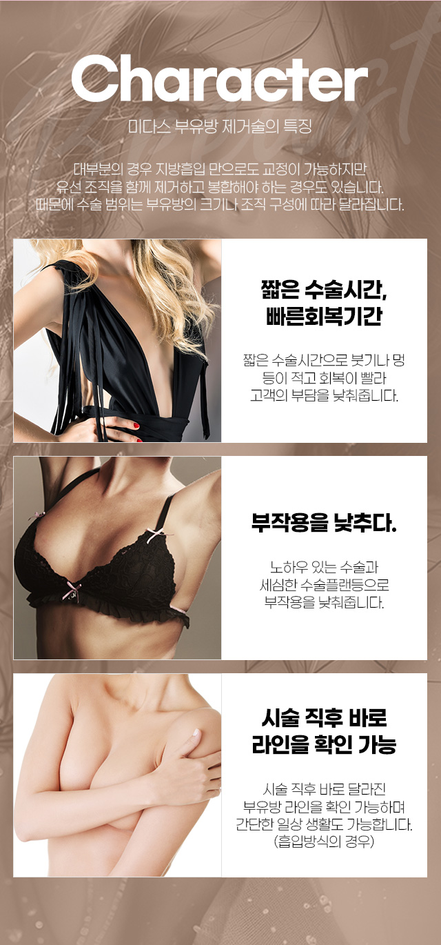 그래도 자존감이 더 높은 경우에는 본인의 몸과 외모가 어떻든 현재의 모습에 만족하며 살아가는 분들도 많을 것입니다.그러나 부유방은 외관상 좋지 않을 뿐만 아니라 불편한 증상이 추가로 발생할 수 있으므로 부산 부유방 수술을 권장합니다.여기서 불편한 증상으로는 부유 쪽 부위에 느껴지는 통증, 불쾌할 정도로 붓는 현상 등이 있고 간혹 부유 쪽이 유방 종양, 유방암으로 이어지는 경우도 있다는 점을 기억하시면 좋겠습니다.단순한 외관상의 문제가 있는 경우에는 개선을 원하는 분만 수술을 하면 되지만 기능에도 문제가 생기면 건강이 악화될 수 있으니 이 부분을 참고하여 개선책을 선택해 보시기 바랍니다.