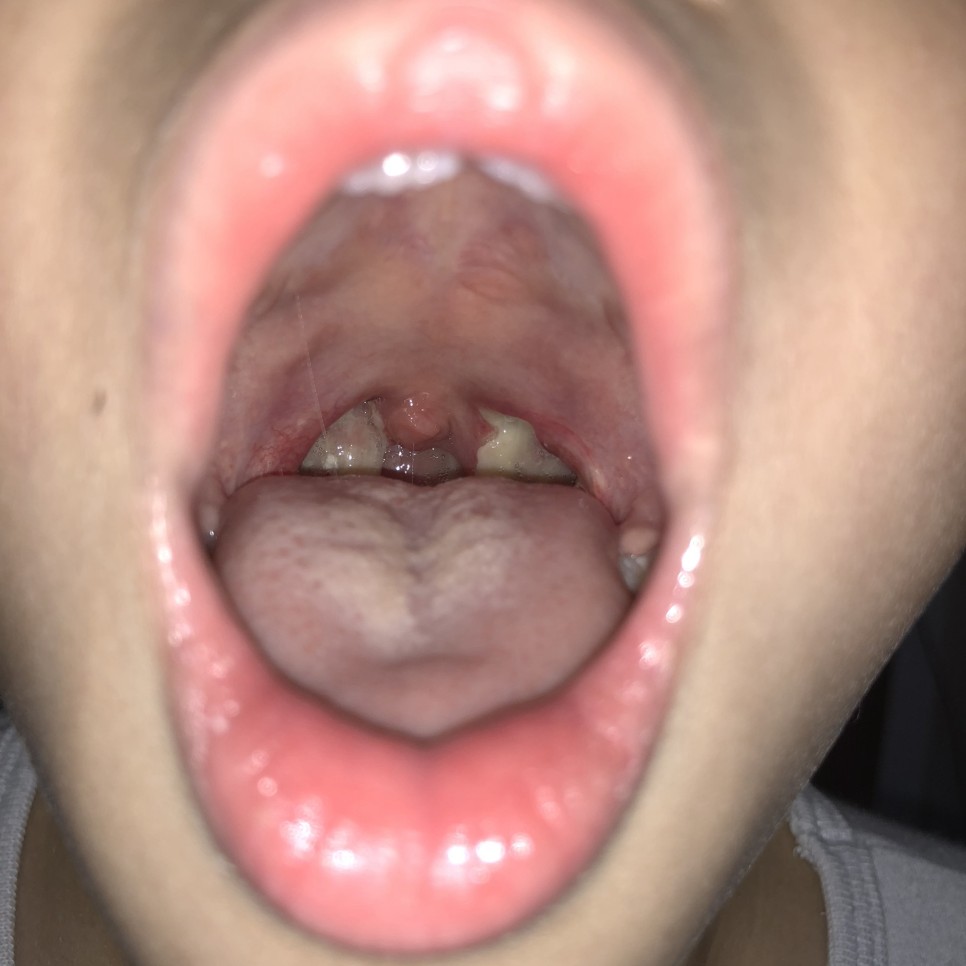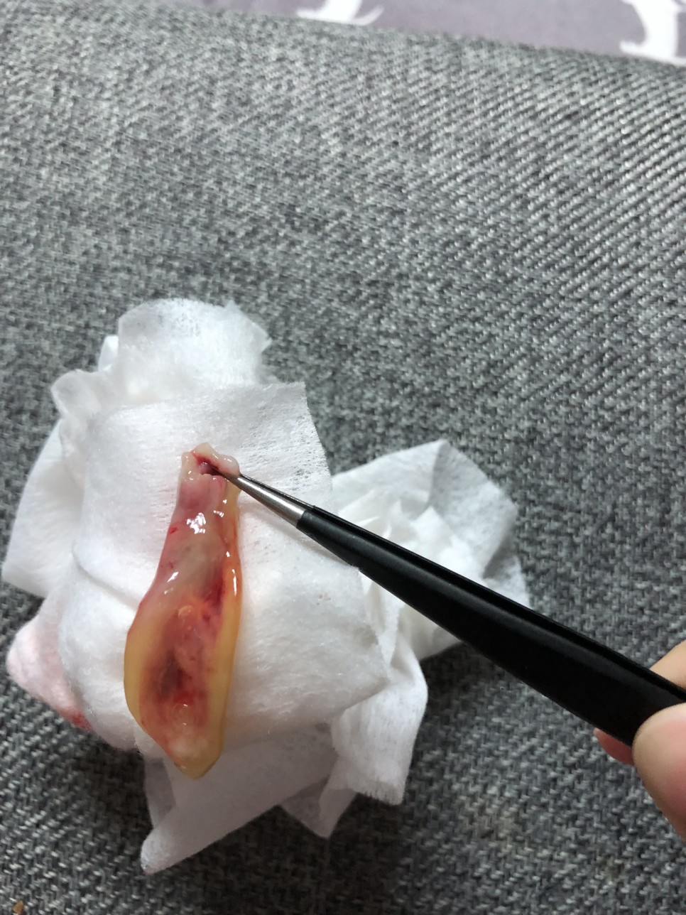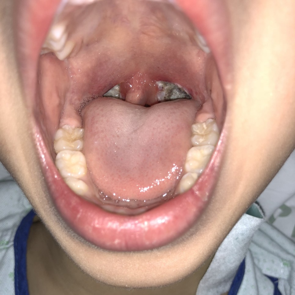 수술 직후에 아데노이드를 제거하여 지진 부위에 하얗게 상처가 있습니다.아직 부어서 피가 안 나요.