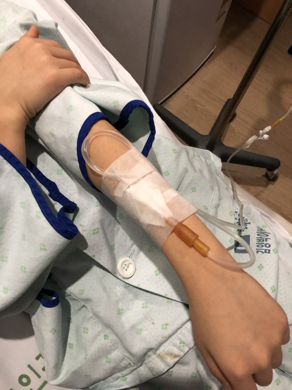 수술하러 가는 길에 수액을 받아서인지 얼굴이 통통하게 부풀었어요.