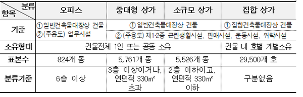 오피스빌딩:건축물대장상의 주 용도가 오피스(업무시설)이고, 6층 이상 일반건축물 중 대형상가:건축물대장상의 주 용도가 상가(제1, 2종 근린생활시설, 판매시설, 운동시설, 위락시설)이며, 3층 이상 또는 연면적 330㎡ 이상인 일반건축물 소규모상가:건축물대장상의 주 용도가 상가(제1, 2종 근린생활시설, 판매시설, 운동시설, 위락시설)이며, 2층 이하 연면적 330㎡ 이하인 일반건축물대장상의 주 용도가 상가(제1종)이다.