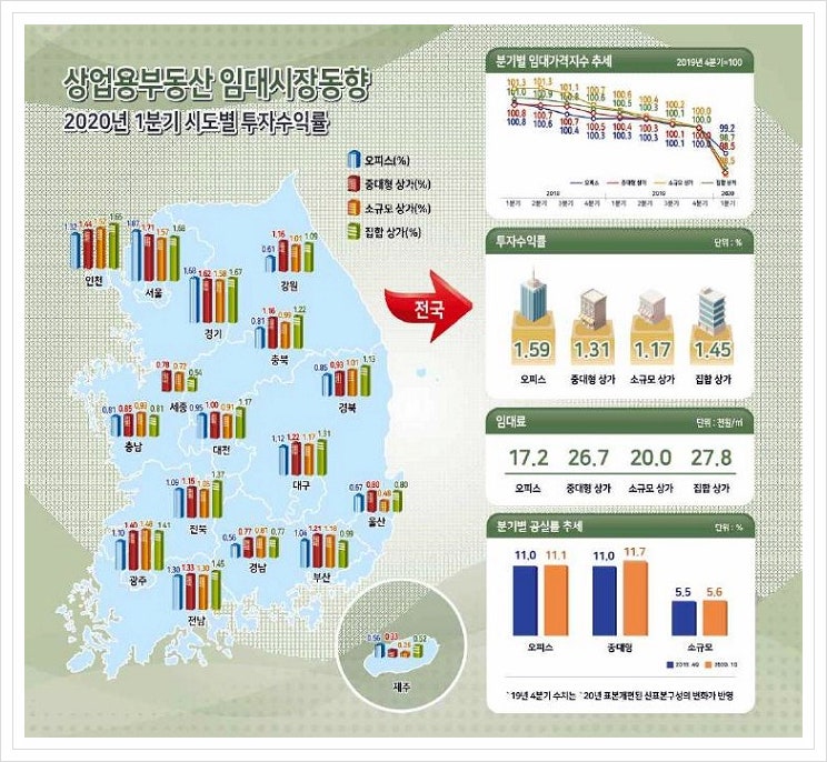 [상업용 부동산 임대동향 통계지도] 상가 임대가격지수, 임대료, 공실률, 수익률 정보