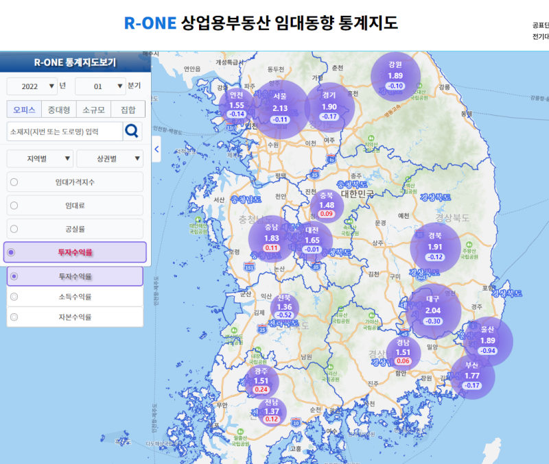 이미지 출처 : 상업용 부동산 임대 동향 통계 지도 ( https://www.reb.or.kr/r-one/statistics/rcsGisViewer.do))