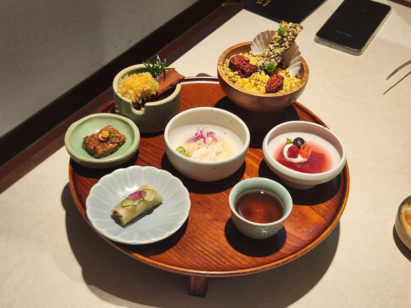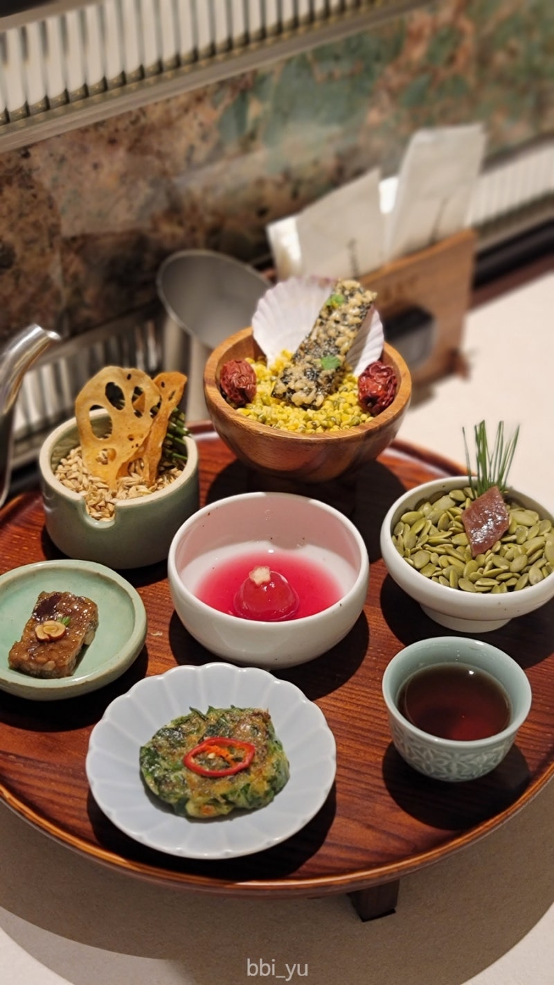 가장 먼저 나오는 한 상차림 너무 예쁘다(눈물) 기조에 먹기 좋게 다양한 재료를 사용해 7가지 에피타이저가 나온다.역시 보기에도 좋은 게 먹기 좋다고 기분 좋게 먹방 시작!