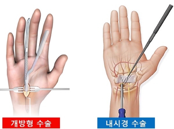 손목터널증후군 치료법 1. 손목터널증후군 진단을 위하여 신경타진검사, 손근굴곡검사, 정중신경압박검사를 시행하고 정확한 손상부위를 확인하기 위하여 방사선검사 및 근전도검사 등을 실시합니다.2. 근육 위축이 없고 증상이 심하지 않은 경우 손목에 보조기를 착용하고 소염제를 복용하거나 손뿌리 관내에 스테로이드를 주사하여 증상을 완화합니다.3. 손목터널증후군 치료에 체외충격파가 널리 사용되고 있으나 체외충격파 치료는 손상된 조직에 체외에서 고주파 에너지를 전달하여 염증을 제거하고 조직 재생을 유도하므로 빠른 회복이 가능합니다.4. 보존적 방법으로 증상이 완화되지 않거나 엄지손가락과 다른 손가락이 무감각하고 엄지근육이 위축된 경우 수술을 합니다. 5. 수술은 피부를 최소한으로 절개한 후 관절경과 특수기구를 사용하여 정중신경을 압박하는 횡수근 인대를 잘라 더 이상 신경이 손상되지 않도록 합니다.