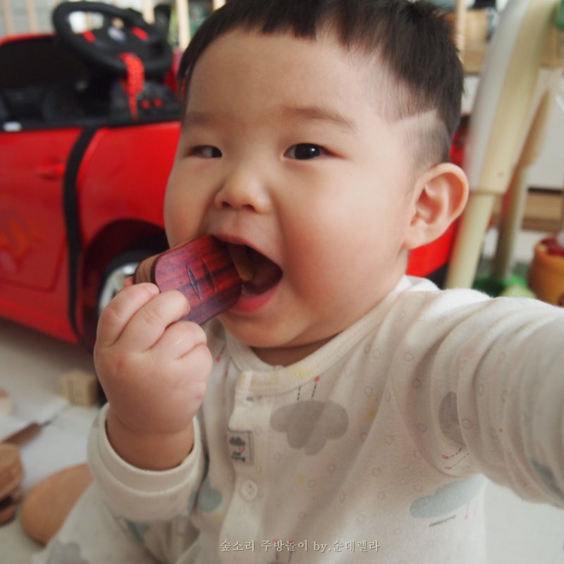 아마 대부분의 경우 이대로 #유아장난감이 입에 들어갈까봐 쉽게 사주지 못하셨겠지만 숲소리 그대로 페인트나 니스를 사용하지 않고 식물성 오일로 마감된 유아장난감이라 입에 넣어도 괜찮다고 합니다.그래서 저도 안심하고 놀아주고 있어요.(웃음)
