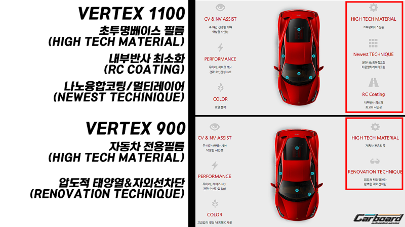 전면 바 텍스 1100VLT30%시공 전후의 비교 모습입니다.OVER VIEW세계에 없던 선팅의 진화. 바 텍스 1100은 루 마 프리미어 무상팅피룸의 최상위 제품입니다.최상위 상팅피룸이 가져야 할 고성능의 광학적 퍼포먼스와 함께 방음 및 안전 등 모든 요소를 갖춘 자동차 상팅피룸의 완전체입니다.Vertex1100, Sunting를 다시 Vertex1100은 태양 적외선 열 차단 90%이상을 실현하기 이동성의 자동차에 사용하는 IT기기에 호환성에서 안전 운전을 제공함은 물론 하루 종일 뜨거운 태양열에 견디어야 한다 건축물에도 적용할 수 있는 전천후 열 차단 필름입니다.바 텍스 1100은 완전, 완벽이라는 의미의 상징입니다.숫자 11은 1의 연속 전 숫자 1은 세계 최초, 후의 숫자 1은 세계 1위 제품이라는 상징성을 나타내고 있습니다.또 숫자 11은 외부의 강한 태양열을 효과적으로 차단하는 이중 차단 벽을 가진 강한 구조의 멀티 레이어 제품을 의미하며 숫자 OO은 자동차와 선글라스를 의미하고 차창 밖의 세계와 하나로 연결하는 선명도를 갖춘 밤낮 최고의 시인성을 발휘하는 제품이라는 것을 상징합니다.1100은 100과 1000의 조합으로 100은 완전, 충족, 모두 전체를 뜻하는 숫자이며 1000이라는 숫자 또한 모두 많은 것, 완전한 것 등을 의미합니다.1100은 이진법에서 12를 의미하는 시계의 12시간, 1년 12개월을 상징하는 것이고 하루 중 가장 왕성한 활동을 하는 강한 태양열을 12시간 지속적으로 차단하고 1년 365일 사계절 만족을 제공한다는 의미가 포함되어 있습니다.TECHNOLOGY첨단 나노 융복합 테크놀로지 바 텍스 1100은 수십억개의 나노 입자로 구성된 다층 박막 나노 융합 코팅으로 결합됩니다.강력한 광학적 퍼포먼스와 강인한 내구성을 갖추고 일반 상팅피룸에 비해서 농밀한 구조와 강력 접착성을 발휘하고 유리 파편 비산 방지는 물론 탑승자가 밖에 나오는 것을 막고 글라스 에어 백의 역할을 할 안전 강화 열 차단 필름입니다.능동 반사 제어와 분광 선택적 차단 VERTEX1100은 능동 반사 제어(ARC/Active Reflection Control)과 분광 선택적 차단(SSB/Spectral Selective Blocking)기술이 적용되면서 내부 빛 반사 및 외부 섬광으로 인한 눈부심을 줄임으로써 내부의 투명성과 가시성을 높이고 시계가 좁아지는 야간 운전의 위험 요소를 줄입니다.도입 멀티 레이어 다층 박막 코팅 고도의 최첨단 나노 융복합 기술력을 적용한 VERTEX1100은 도입 멀티 레이어(IL)구조에서 태양열을 가두어 놓는 유리를 통해서 밖으로 분산시키고 최대한의 열 방출을 제공하도록 설계되었습니다.바 텍스 1100은 운전 편리성을 높이고 가족과 프라이버시, 고급으로 품격을 추구하는 자동차 매니아를 위한 최고의 선물입니다.