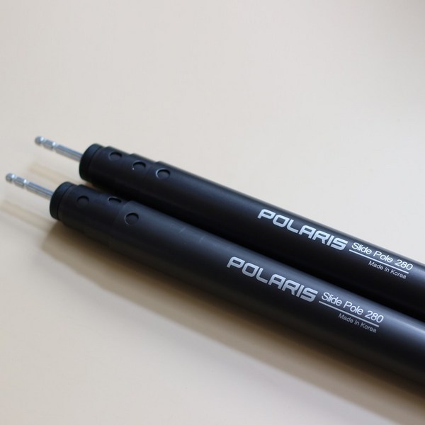 러프 블랙과 러프 티타늄 두 가지 색상으로 출시되었으며, 제가 사용한 것은 러프 블랙입니다.메인 터프 폴로 사용하기 좋은 최대 280cm 제품과 사이드 폴로 사용하기 좋은 최대 210cm 두 사이즈로 블랙 색상의 인기가 높아 향후 러프 블랙 색상 생산에 더 집중할 것 같다는 소식도 조금 들은 것 같습니다. ● 메인폴: 슬라이드 4단 230~280cm (수납길이 92cm), 무게 1.3kg● 사이드폴: 슬라이드 3단 160~210cm (수납길이 86cm), 무게 0.7kg● 재질: 알루미늄 6061