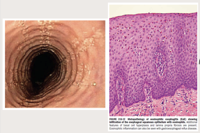 (왼쪽) 내시경소견, (오른쪽) 조직검사소견증상에서 하나씩 살펴보겠습니다.유럽 가이드라인에서는 소아와 성인의 증상을 나누어 설명을 하고 있었습니다. 소아의 경우 역류가 주된 증상으로 구토, 복통, 식사 거부 등의 증상이 있으며 성인의 경우 고형물 섭취가 어렵고 흉통이 일어나는 것으로 알려져 있습니다.