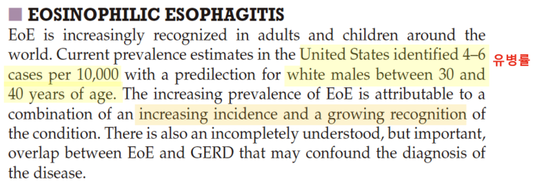 일반적으로 식도와 관련된 증상이 있어 내시경을 받는 환자 중 7% 가까이 호산구 식도염의 빈도가 보고되며 삼키기 곤란, 음식물 관련 증상이 동반되는 환자 중에서는 호산구 식도염의 빈도가 23%-50%까지 올라갈 수 있다고 보고하였습니다. 그러나 중요한 점은 증상과 식도의 조직학적 소견이 반드시 일치하는 것은 아니기 때문에 증상만으로 진단이나 치료경과를 판단하지 않는다는 점을 강조하고 있습니다.역학 호산구 식도염 유병률은 미국 기준 1만명당 4~6명이며, 주로 30~40대 백인 남성으로 밝혀지고 있습니다. 최근 호산구 식도염 유병률이 증가하는 이유는 호산구 발생 자체의 증가와 함께 인식의 증가가 복합적으로 작용하고 있다고 보고하고 있습니다.
